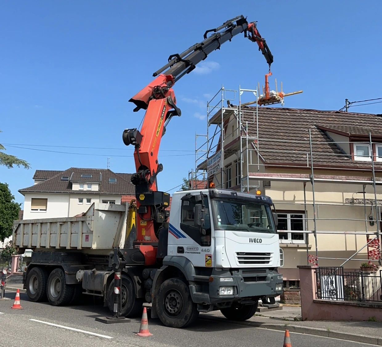 Nous réalisons vos opérations de levage avec notre camion-grue directement depuis Fegersheim. Que ce soit pour la manutention de matériaux, la pose d’éléments en hauteur ou l’accès à des zones difficiles, nous assurons un travail précis, sécurisé et adapté à chaque chantier. Cette vidéo vous montre notre savoir-faire en conditions réelles.